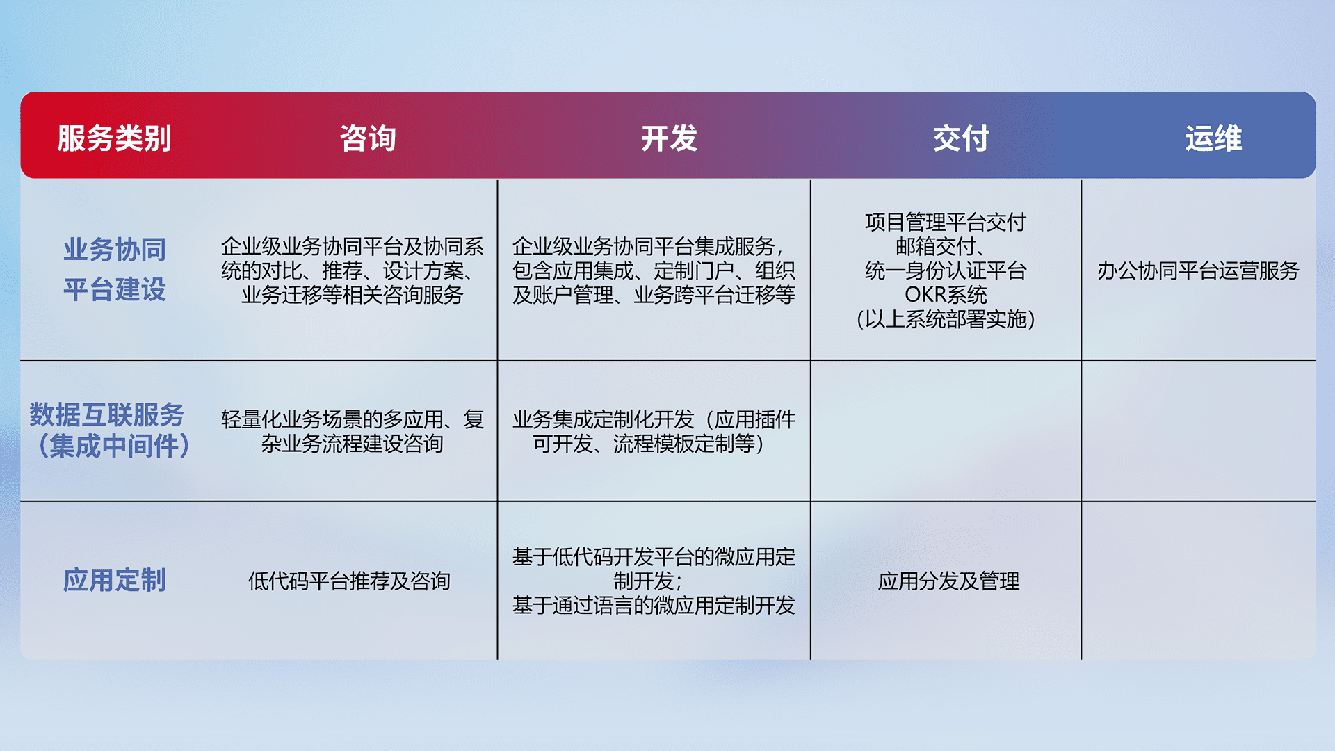 针对钉钉、、、、企微、、、IDaas等平台级产品提供产品的规划、、、、方案、、、、交付、、定制化开发等服务,,,,实现如统一协同办公、、智能客户服务、、混合会议管理、、、智能数据查询、、等业务场景,,,实现数字化转型。。。